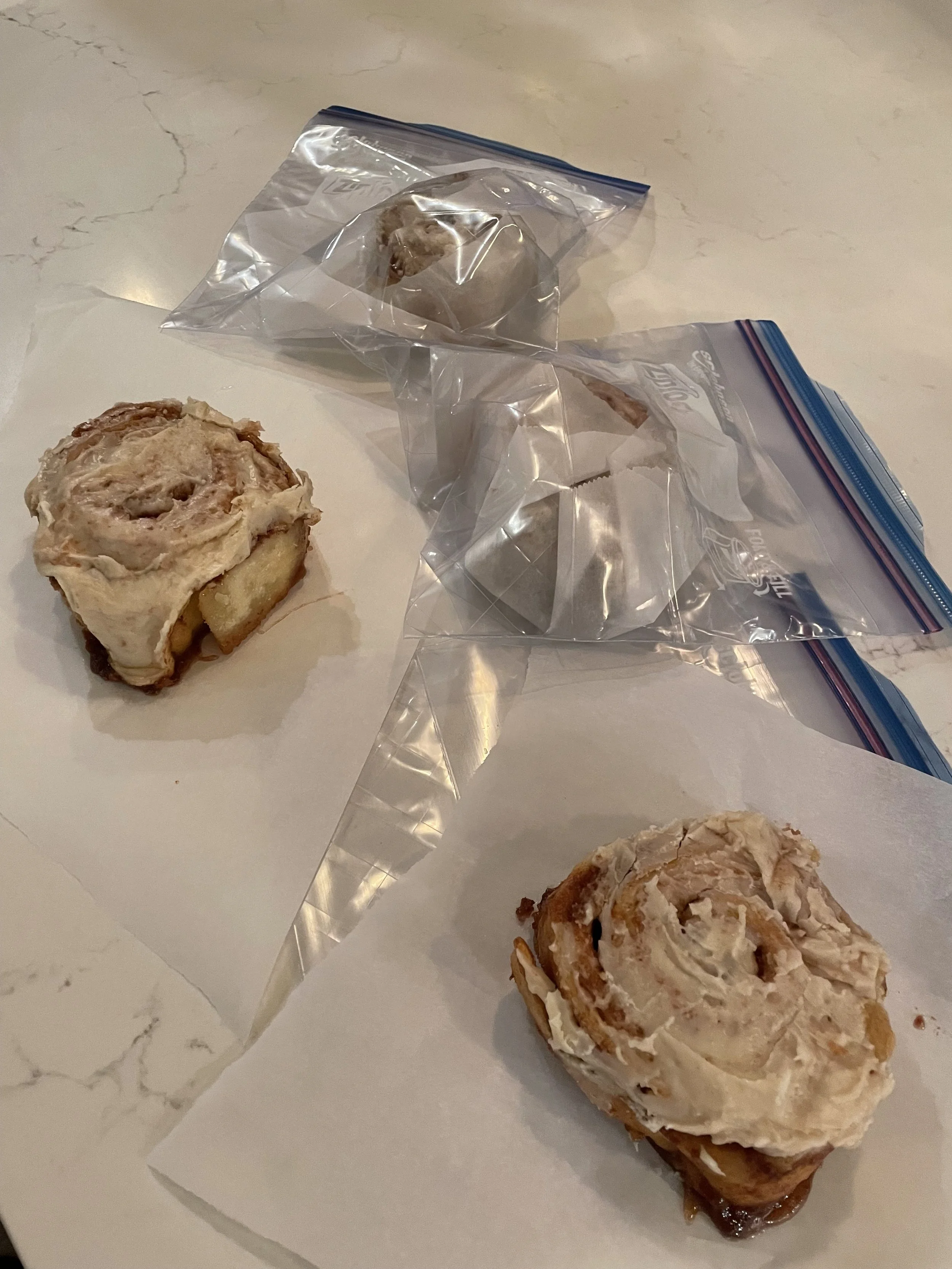You can also place cinnamon rolls on parchment paper and in freezer bags to store for a rainy day, or eat the whole tray… Totally an option!