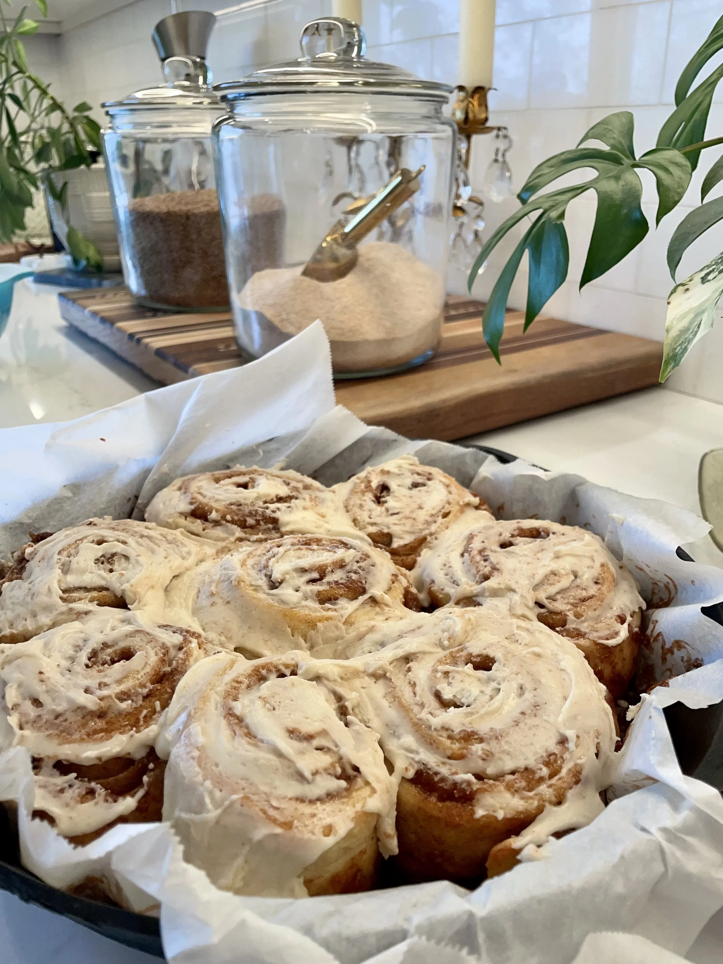 Place a layer of parchment paper in a cast iron skillet and place your cinnamon rolls. Face seams inward so they don’t unravel. A baking tray or casserole dish works too.